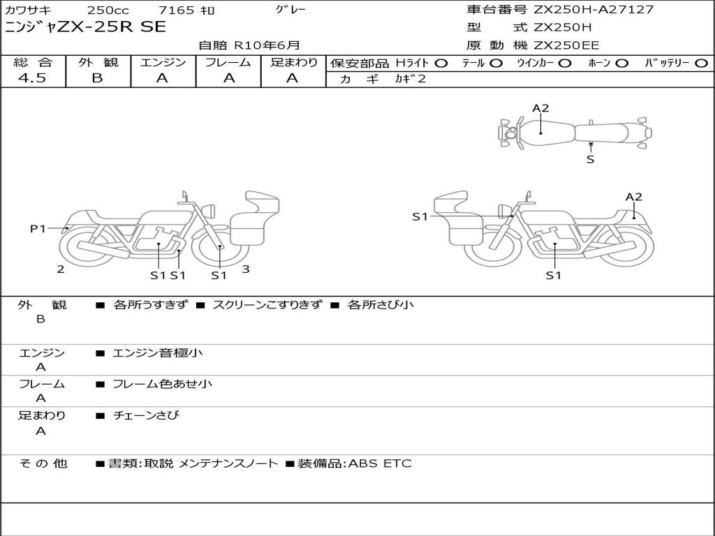 | Номер рамы / VIN | ZX250H-A27127 |