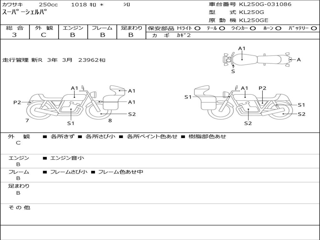 | Номер рамы / VIN | KL250G-031086 |