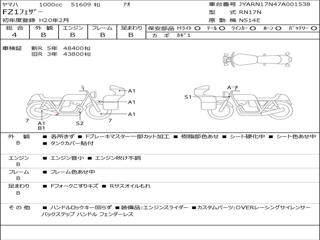 | Номер рамы / VIN | JYARN17N47A001538 |