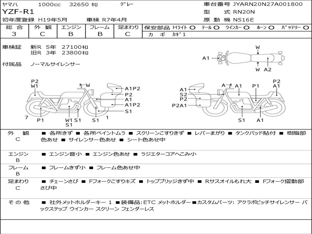 | Номер рамы / VIN | JYARN20N27A001800 |