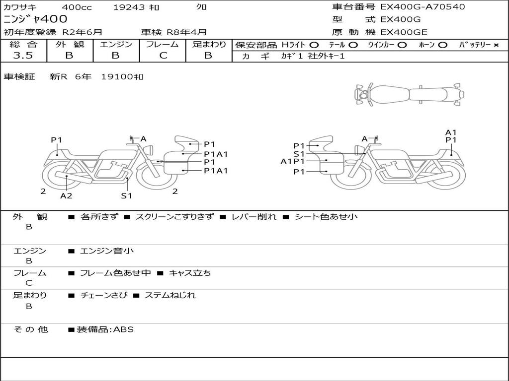 | Номер рамы / VIN | EX400G-A70540 |