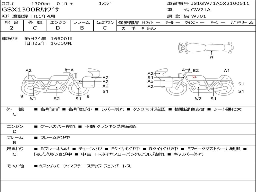| Номер рамы / VIN | JS1GW71A0X2100511 |