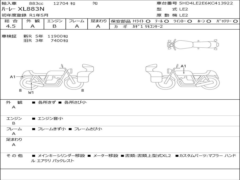 | Номер рамы / VIN | 5HD4LE2E6KC413922 |