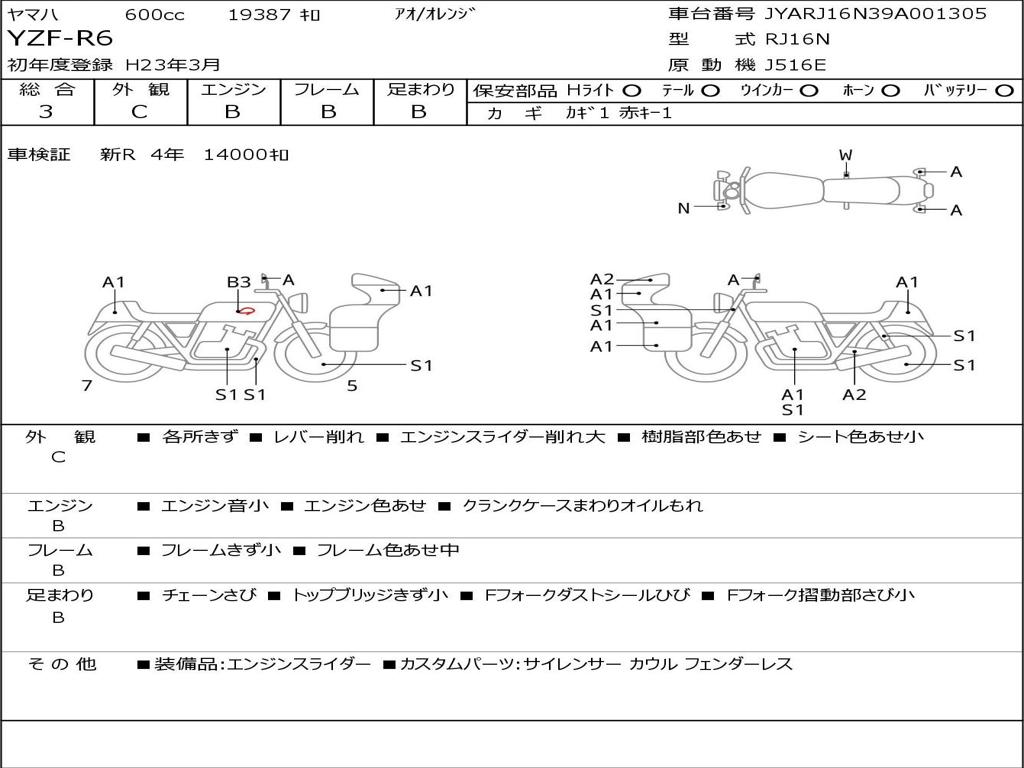 | Номер рамы / VIN | JYARJ16N39A001305 |