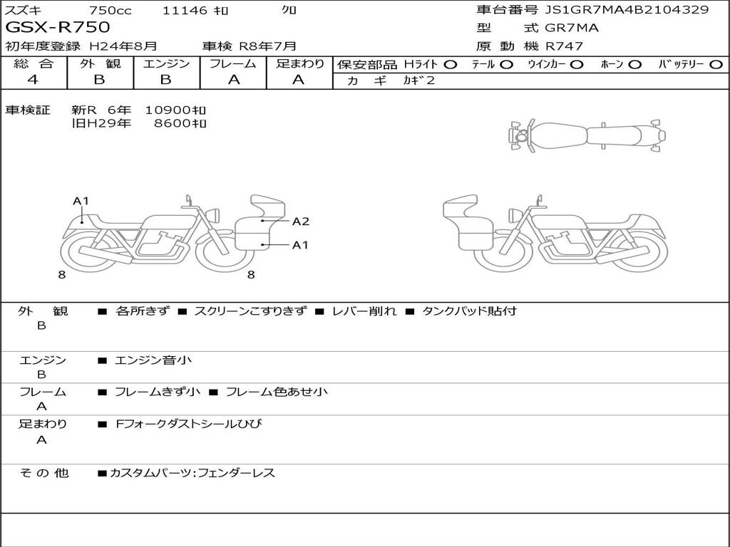 | Номер рамы / VIN | JS1GR7MA4B2104329 |