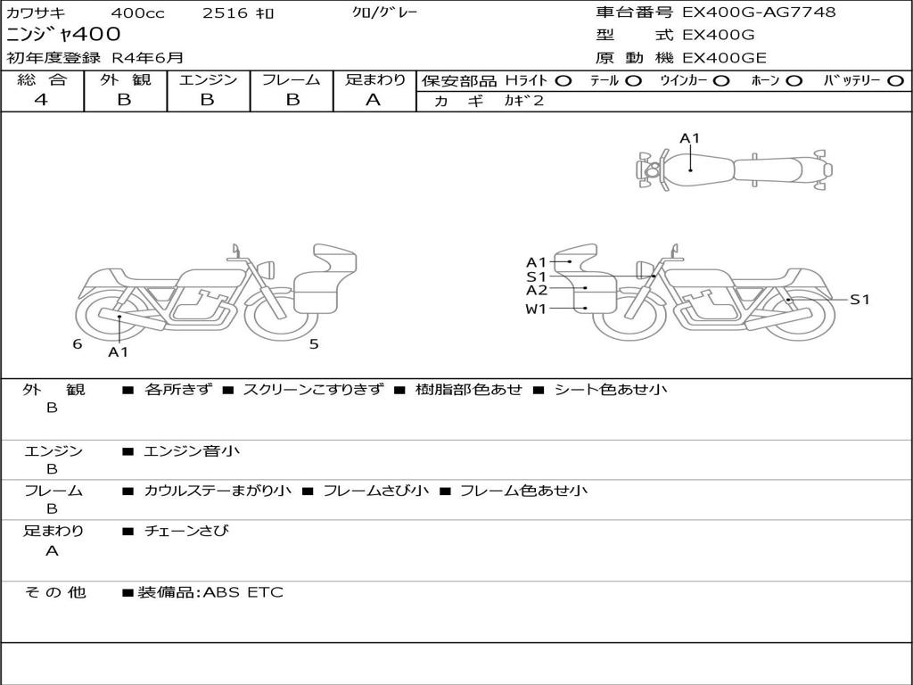 | Номер рамы / VIN | EX400G-AG7748 |