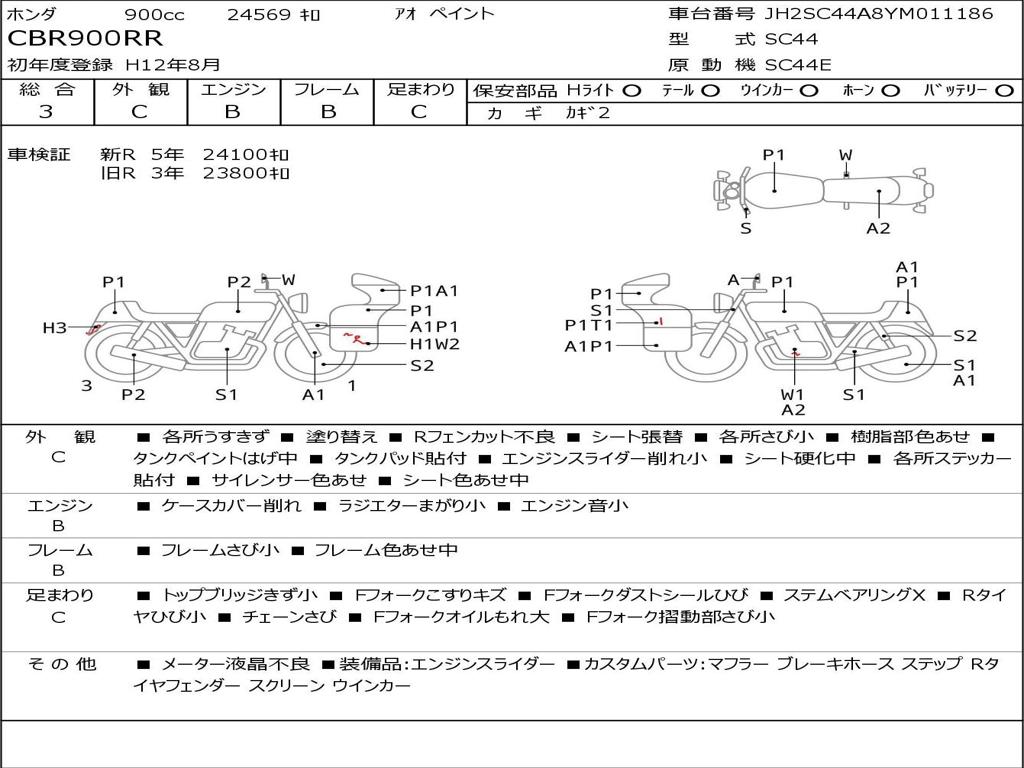 | Номер рамы / VIN | JH2SC44A8YM011186 |