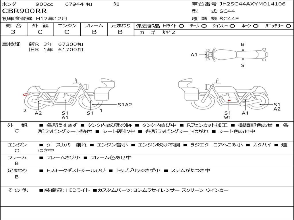 | Номер рамы / VIN | JH2SC44AXYM014106 |