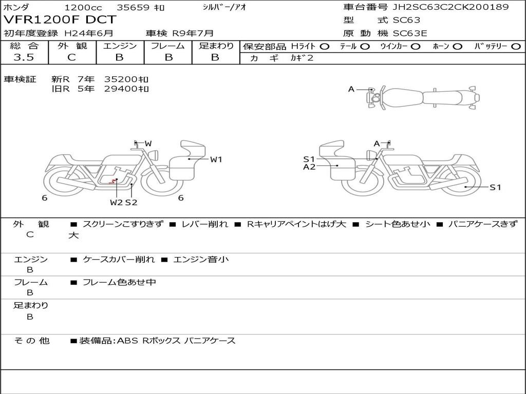 | Номер рамы / VIN | JH2SC63C2CK200189 |