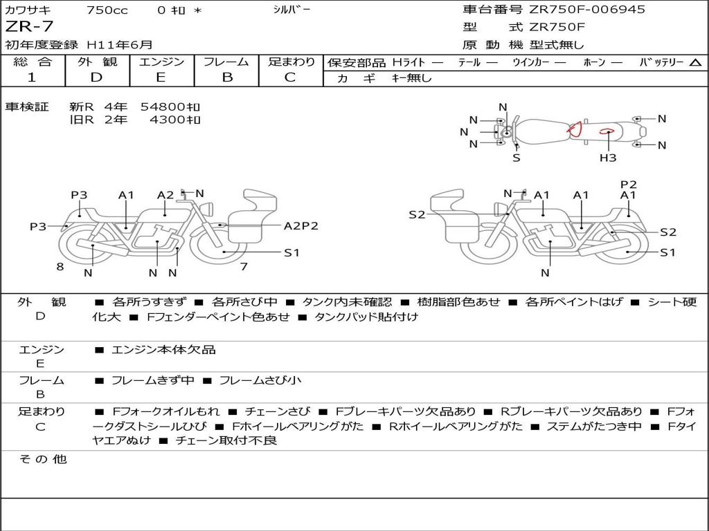 | Номер рамы / VIN | ZR750F-006945 |