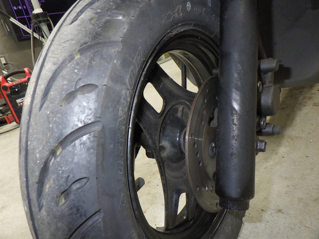 | внешняя часть вилки | потертость, потек масла <много> |