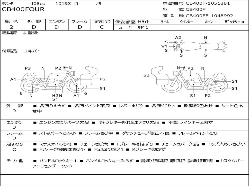 | Номер рамы / VIN | CB400F-1051881 |