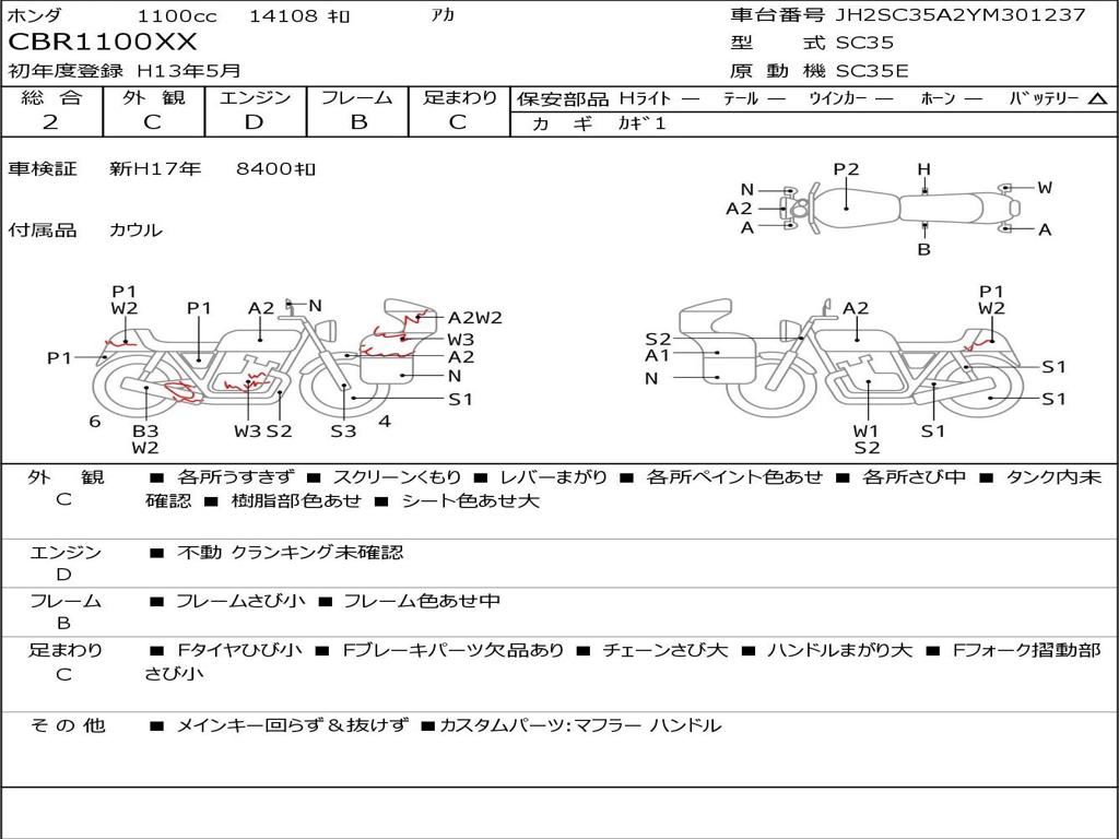 | Номер рамы / VIN | JH2SC35A2YM301237 |