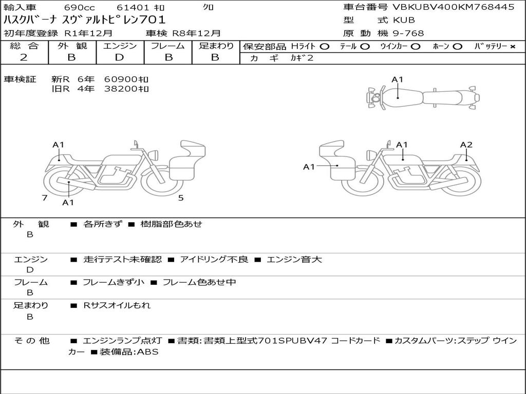 | Номер рамы / VIN | VBKUBV400KM768445 |