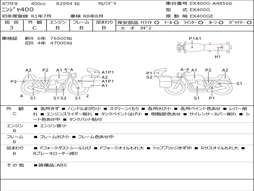 | Номер рамы / VIN | EX400G-A48566 |