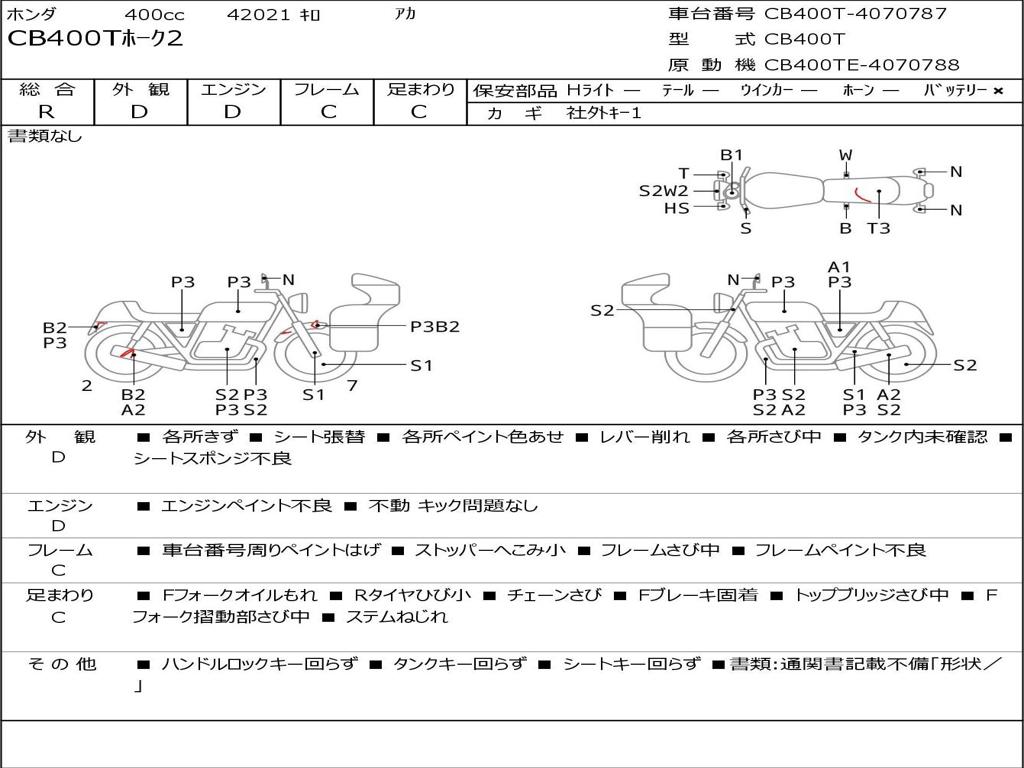| Номер рамы / VIN | CB400T-4070787 |