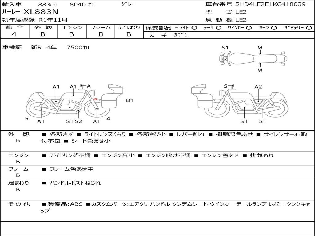 | Номер рамы / VIN | 5HD4LE2E1KC418039 |