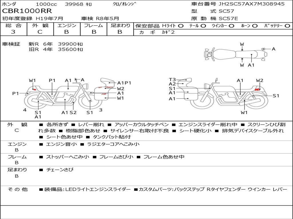 | Номер рамы / VIN | JH2SC57AX7M308945 |