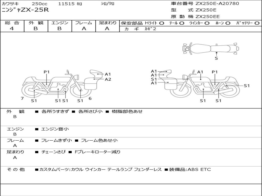 | Номер рамы / VIN | ZX250E-A20780 |