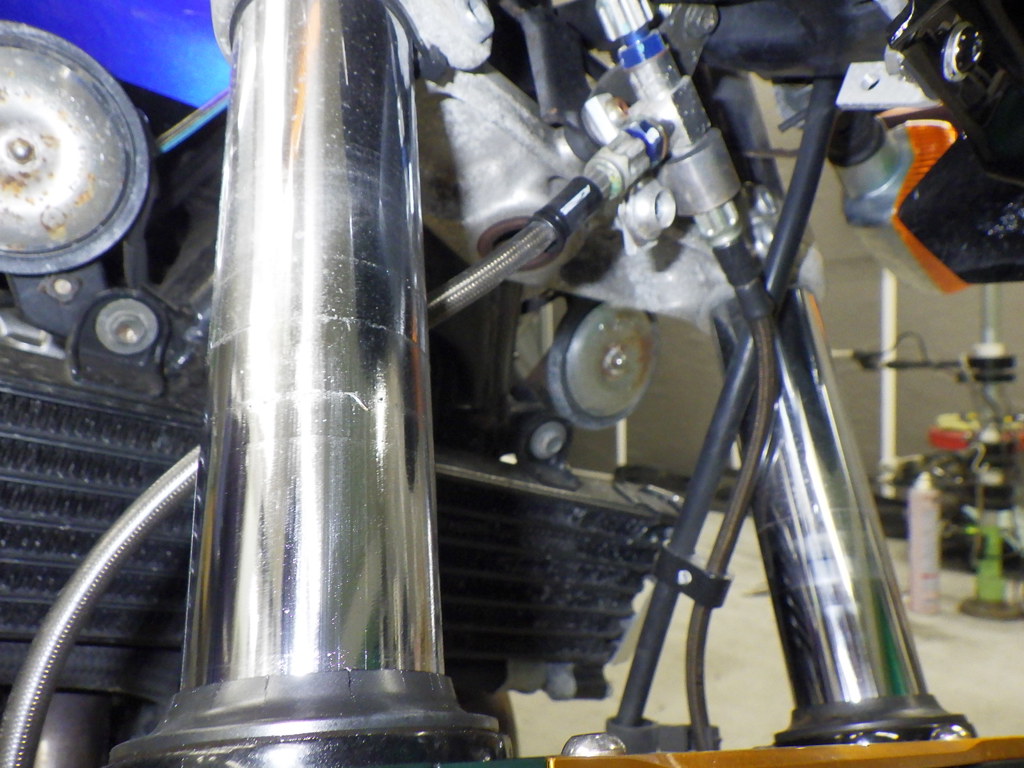 | внешняя часть вилки | потек масла <много>, перекрашено |