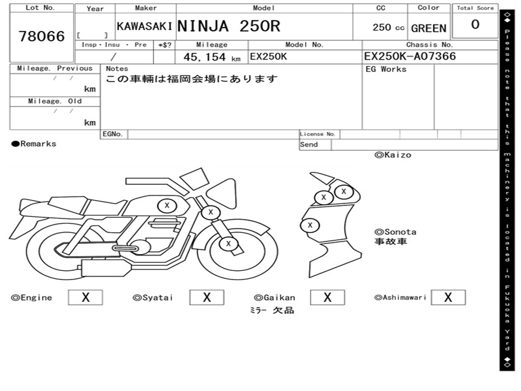 | Номер рамы / VIN | EX250K-A07366 |