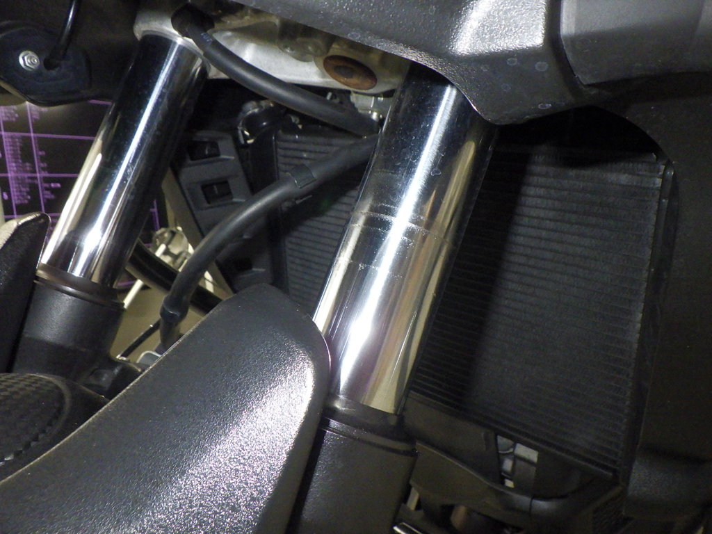 | внешняя часть вилки | царапины <немного>, потек масла <много> |