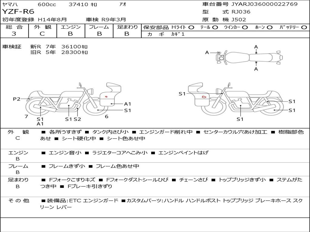 | Номер рамы / VIN | JYARJ036000022769 |