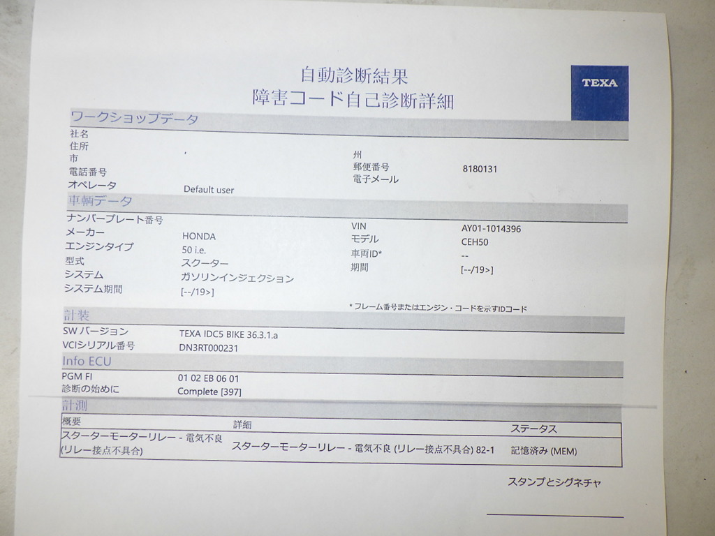 | Номер рамы / VIN | AY01-1014396 |