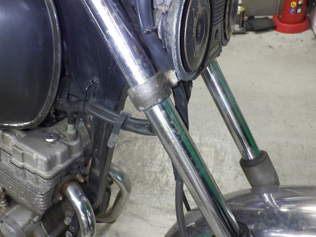| внешняя часть вилки | следы коррозии <много>, полирован., потек масла, неисправен сальник |