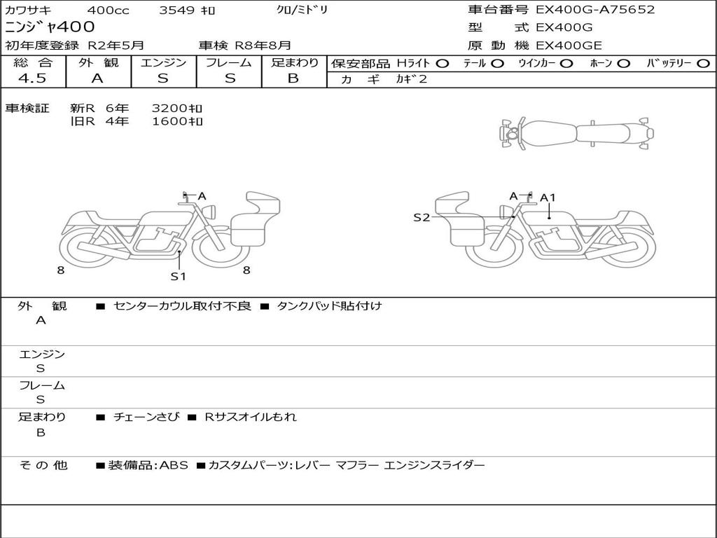 | Номер рамы / VIN | EX400G-A75652 |